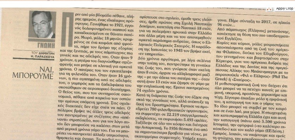 Άρθρο του μέλους μας Δημήτρη Παρασκευά που δημοσιεύθηκε στην εφημερίδα το ΒΗΜΑ, την Κυριακή 18 Απριλίου 2021 με τίτλο, “Ναι μπορούμε”. ΝΑΙ, ΜΠΟΡΟΥΜΕ Πριν μια βδομάδα, πέθανε, “πλήρης ημερών”, ένας ιδιαίτερος πρόσφυγας. Γεννήθηκε το 1921, εγγονός δολοφονημένου παππού και καταδικασμένου σε θάνατο πατέρα. Μωρό, μόλις 18 μηνών, κρυμμένος σε ένα καφάσι από φρούτα, πήρε το δρόμο της εξορίας και [read more...]