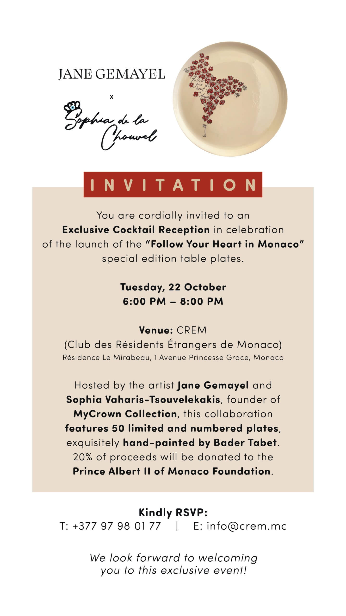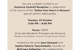 We are delighted to invite the members and friends of the Hellenic Community of Monaco to an Exclusive Cocktail Reception in celebration of the launch of the “Follow Your Heart in Monaco” special edition table plates. This special event, hosted by Jane Gemayel and Sophia Vaharis-Tsouvelekakis, founder of MyCrown Collection and Honorary President of the Hellenic Community of Monaco,